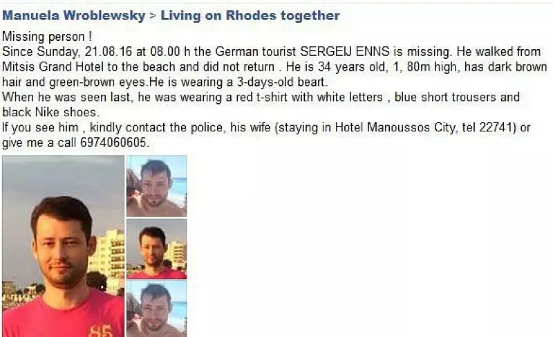 „Um 9 Uhr sollte die Familie vom Mitsis Grand Hotel Rhodos zum Flughafen gebracht werden", berichtet seine Schwester Natalie Eisenbraun. Um sieben sei ihr Bruder noch einmal kurz zum nahen Strand gegangen, um die von seinen Kindern gesammelten Muscheln und Steine zurück zu bringen - doch er kommt nicht zurück ins Hotel, am Strand verliert sich seine Spur. Als Sergej Enns das Hotel verlässt, trägt er leichte Kleidung und nimmt nur sein Handy mit, das mittlerweile ausgeschaltet oder defekt ist. Er hat weder Geld noch Papiere bei sich.