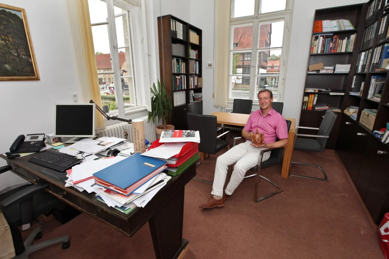 Kreis Lippe. Von seinem Büro aus kann Dr. Michael Zelle direkt auf den Schlossgraben schauen. Der 49-Jährige ist der Museumsdirektor. Das 20 Quadratmeter große Büro ist lichtdurchflutet. Durch die Fensterfront direkt vor seinem Schreibtisch, hat er einen großen Vorteil. „Wenn ich hier sitze, kann ich sehen, wer ein- und ausgeht“, lacht der studierte Archäologe, der seit 2011 an der Spitze des Lippischen Landesmuseums steht und gemeinsam mit 22 Mitarbeitern neue Projekte entwickelt.
