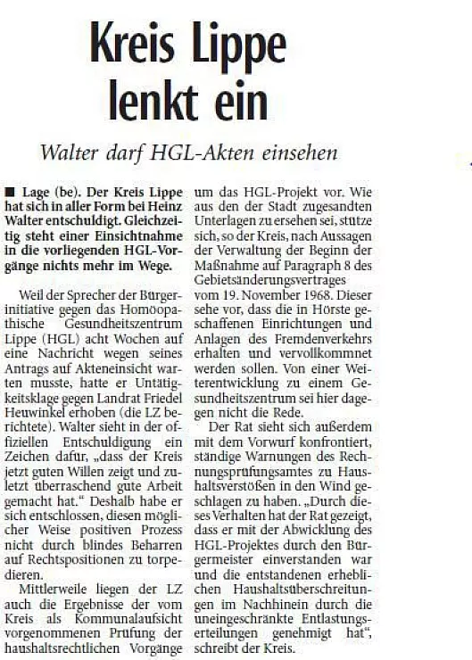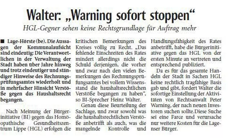 Als bekanntgegeben wurde, dass die Universität Witten-Herdecke ein homöopathisches Institut im HGL einrichten wollte, schrillten bei Heinz Walter die Alarmglocken. „Auch daran war nicht das Geringste wahr", erinnert er sich. Von Anfang an war er erbitterter Gegner des Homöopathischen Gesundheitszentrums. Aus der von ihm gegründeten „Bürgerinitiative gegen das HGL" entwickelte sich später die Bürgerbewegung für Lage (BBL), die seit 2004 im Rat sitzt. „Ständig wurde Geld ausgegeben für Leistungen, die aber nie erbracht wurden", so der pensionierte Lehrer aus dem Ortsteil Hörste.