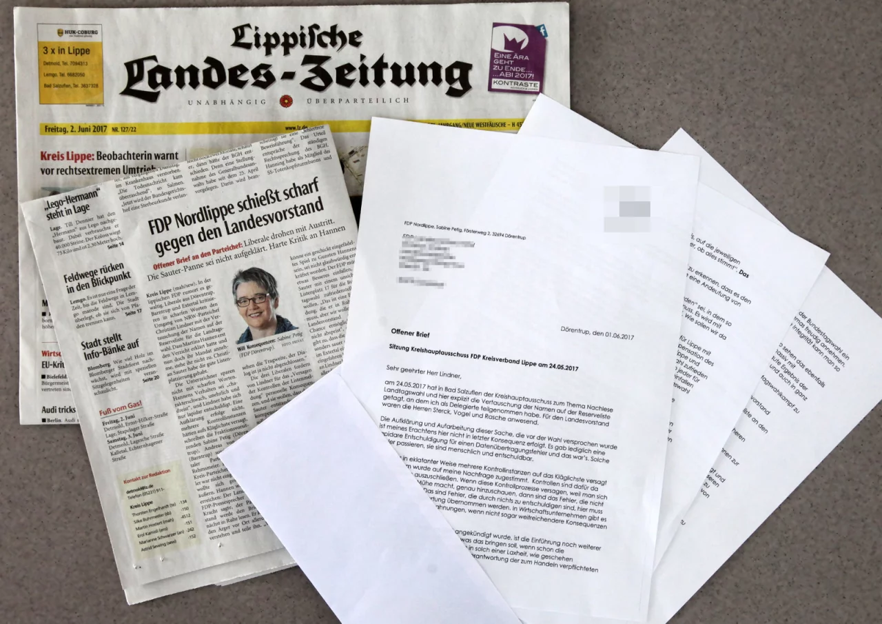 Die drei Liberalen fordern von Lindner für das „Versagen der Kontrollen der Listenmeldung" personelle Konsequenzen, und sie wollen, dass der für Sauter entstandene Schaden kompensiert wird. Außerdem soll sich der Landesvorstand von der Argumentation Hannens zur Annahme des Mandates distanzieren. Schließlich habe sie vor der Wahl erklärt, auf das Mandat zu verzichten – dies habe der Landesvorstand ja begrüßt. Hannen habe für dieses Verhalten bei der Sitzung des Kreishauptausschusses Applaus enthalten. Nun die Kehrtwende mit Wissen und Beteiligung der Landes-FDP. „Für wie blöd halten Sie eigentlich die Wähler in Lippe?", fragen die Unterzeichner Lindner.