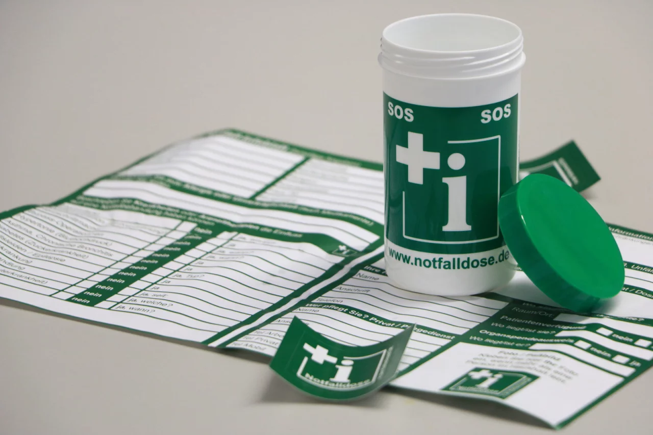 Der Behälter mit grünem Aufdruck und ebensolchem Deckel enthält ein Informationsblatt, auf dem Auskünfte zur eigenen Person, den Vorerkrankungen und ständig eingenommenen Arzneimitteln eingetragen werden können, aber auch Kontaktdaten der Angehörigen, der Hausarztpraxis und sogar über möglicherweise zu versorgende Haustiere.