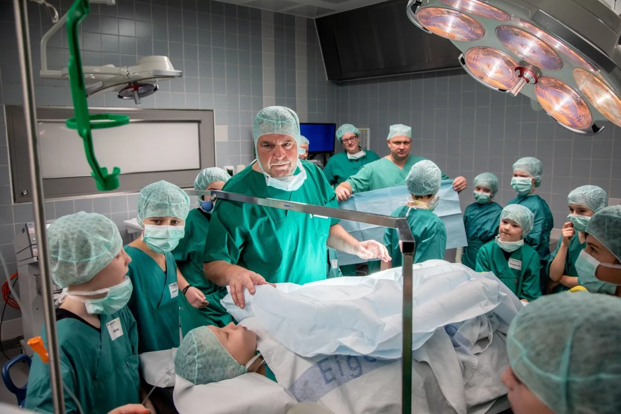 Detmold. Jonathan kommt in den OP. Der junge LZ-Student gelangt auf dem gleichen Weg in den sensiblen Bereich des Klinikums wie sonst verletzte oder kranke Patienten. Über die sogenannte Schleuse nehmen Karl-Heinz Nimczewski und Thomas Herden den neuen Patienten entgegen. Die übrigen Studenten der Kinderuni stehen im Halbkreis dahinter und schauen den Profis bei ihrer Arbeit aufmerksam über die Schulter. Anschließend geht es in den Narkoseraum.