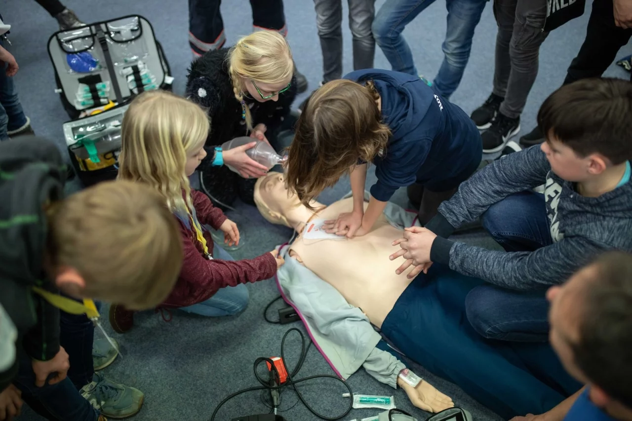 „Um ein Menschenleben zu retten, braucht ihr nämlich nur eure beiden Hände und etwas Atem", fasste Oberarzt Daniel Fischer es für die 26 Kinder zusammen. In gut zwei Stunden lernten sie anschließend, wie unser Körper überhaupt mit Sauerstoff versorgt wird und was geschieht, wenn das einmal nicht mehr passiert.