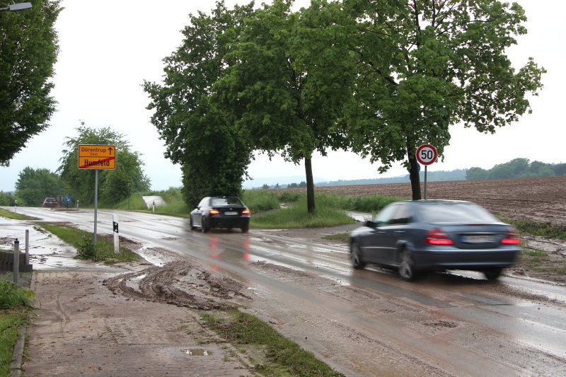 „Wir waren schnell hier, weil wir wegen des Unwetters sowieso alle unterwegs waren", sagte der Dörentruper Feuerwehrsprecher Thomas Lalk. Das Unwetter hatte unter anderem in Humfeld und Farmbeck Straßen und Wege mit Wasser und Schlamm überflutet. Die Bundesstraße 66 wurde gegen 22 Uhr zwischen Dörentrup-Zentrum und Humfeld gesperrt, weil erneuter Starkregen Schlamm auf die Fahrbahn schwemmte.