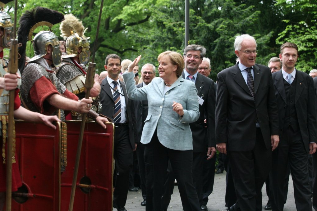 „Ich kann nur jeden einladen, sich hier mit deutscher Geschichte zu befassen." Angela Merkel zeigt sich am 15. Mai 2009 sichtlich beeindruckt von der Hermannsschlacht-Ausstellung „Mythos", die das Lippische Landesmuseum auf die Beine gestellt hat. Zur Eröffnung kam die Kanzlerin sogar nach Detmold. Vor dem prominenten Besuch wurde die Stadt auf Vordermann gebracht und der Schlossgraben abgefischt, damit alles tipptopp aussieht.