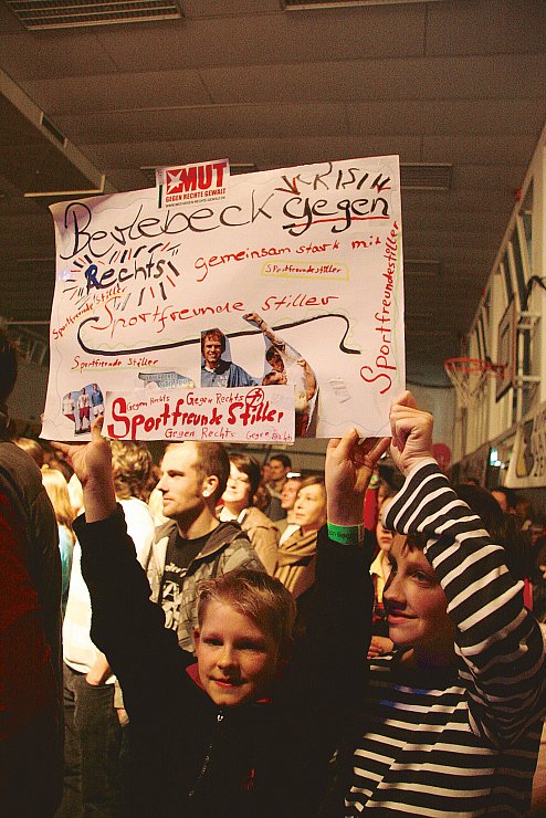 „Berlebeck gegen Rechts" heißt es am 29. März 2008 in voller Lautstärke. Das Bündnis hatte sich zum Aktionstag besondere Gäste eingeladen: Die Deutschrockband „Sportfreunde Stiller" kicken erst gegen die Fußballer aus Berlebeck und singen am Abend: „Wir schaun uns an, reichen uns die Hand – tun uns zusamm’, egal wo und wann. Und im Kopf gesund gegen Gedächtnisschwund rollt er los, der Antinazibund".