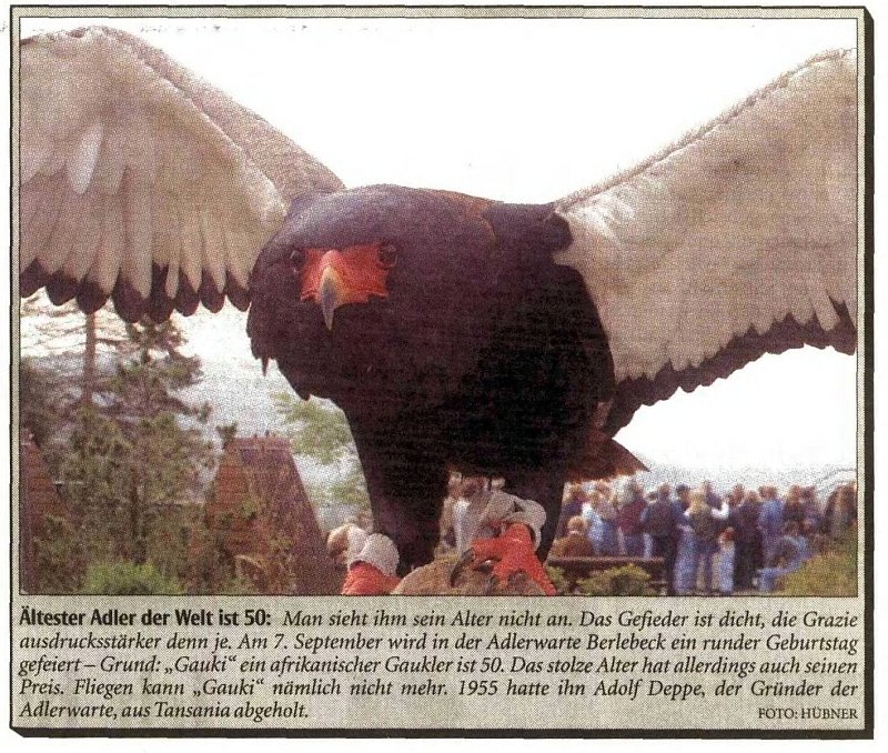 „Gauki" gilt damals mit seinen mehr als 50 Jahren laut Chef-Falkner Klaus Hansen als der älteste Adler der Welt. Fliegen kann „Gauki" in seinem stolzen Alter nicht mehr. Der Vogel war 1955 von Adolf Deppe, dem Gründer der Adlerwarte, aus Tansania geholt worden. Und noch einige Jahre kommen dazu. Erst 15 Jahre später, im Mai 2018, stirbt „Gauki".