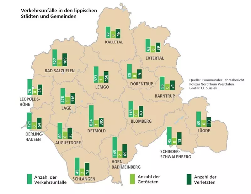 Im landesweiten Vergleich sehen die Zahlen gut aus. Setzt man die Zahl der Verunglückten in das Verhältnis zu den Einwohnerzahlen, liegt Lippe mit 340 unter dem Landeswert von 401. In NRW gibt es 29 Landratsbehörden, vergleicht man die Verkehrshäufigkeitszahl, liegt Lippe auf Platz 3.