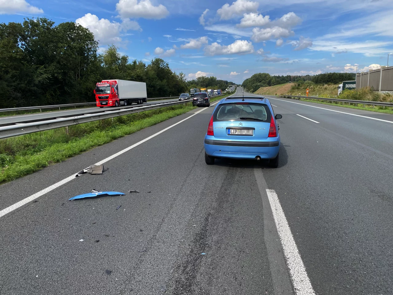 Gegen 14.45 Uhr hatte ein Citroen-Fahrer aus Lippe die Bremsung des vor ihm fahrenden Ford S-Max mit lippischem Kennzeichen zu spät erkannt. Weil es dem Unfallverursacher zunehmend schlechter ging, alarmierte die Polizei Rettungskräfte nach. Der schwer verletzte Lipper wurde schließlich unter Begleitung eines Notarztes in ein Bielefelder Krankenhaus gebracht. Der Fahrer des Fords hatte noch Glück im Unglück und wurde nur leicht verletzt.