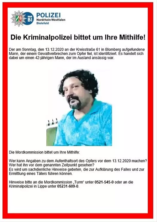 Blomberg. Die Ermittler sind im Fall um den am 13. Dezember an der Kreisstraße 61 in Blomberg aufgefundenen Toten einen großen Schritt weiterkommen. Der bislang unbekannte Mann ist nach einem Hinweis einer anderen Polizeibehörde identifiziert worden, teilen Detmolder Staatsanwaltschaft und Bielefelder Polizei in einer gemeinsamen Pressemitteilung mit.