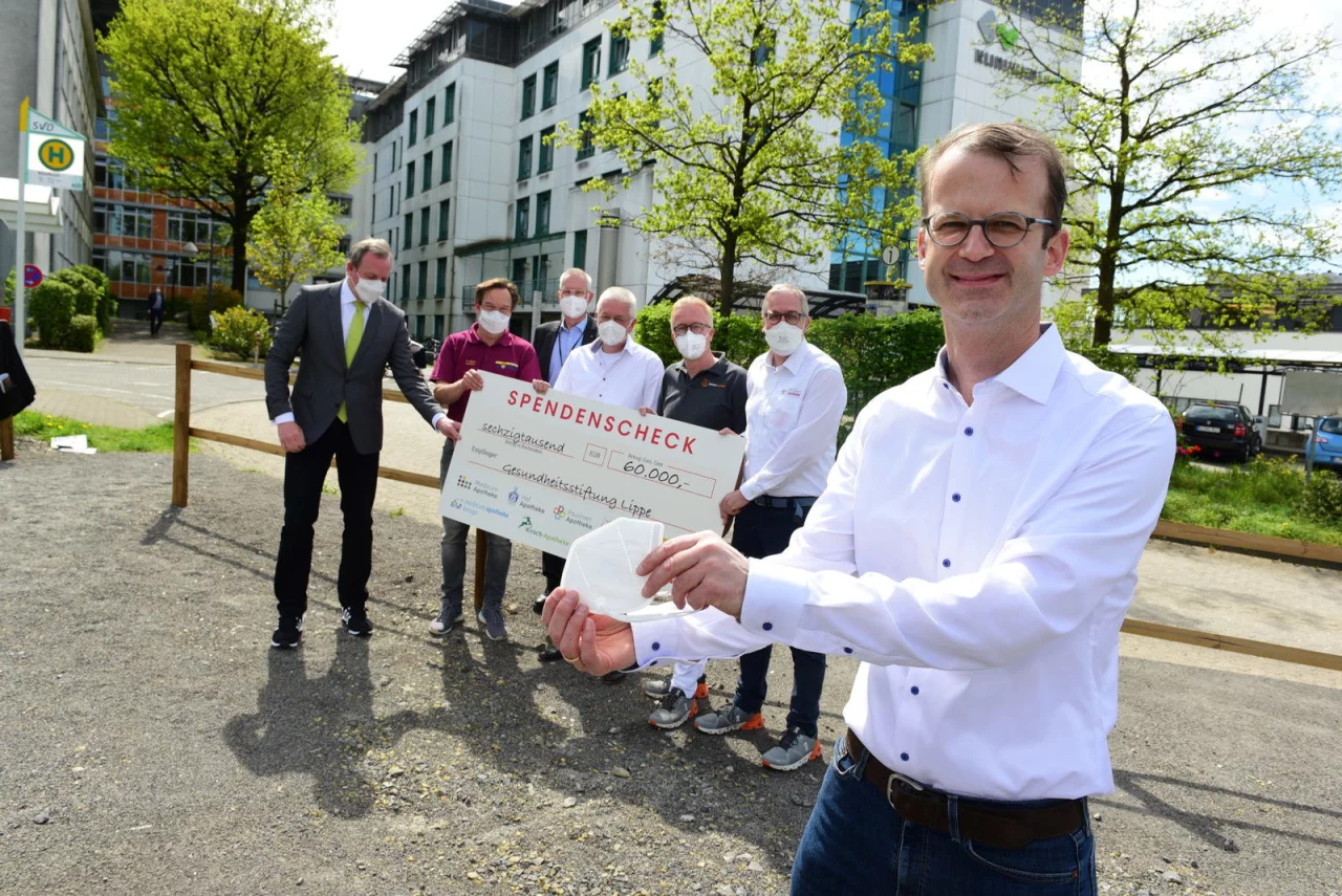 Vor dem Klinikum Detmold nahm Dr. Johannes Hütte, Geschäftsführer Klinikum Lippe und stellvertretender Vorsitzender des Vorstandes der Gesundheitsstiftung Lippe, den obligatorischen Scheck im Namen der Gesundheitsstiftung Lippe entgegen. Das Geld soll in die Forschung, genauer in die Biobank investiert werden, sagt Hütte. Da das Klinikum Lippe mittlerweile Uniklinik ist, sei mit der Förderung dieses millionenschweren Projektes das Geld sehr gut angelegt. Bei der Biobank handelt es sich um eine Art Datenbank, in der verschiedene menschliche Stoffe eingelagert und um verschiedene Informationen ergänzt werden, um dann zu einem späteren Zeitpunkt analysiert werden zu können.