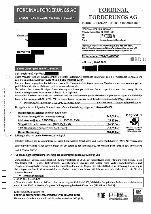 "Bitte gehen Sie nicht auf die Forderungen der "Fordinal Forderungs AG" ein und überweisen Sie grundsätzlich kein Geld auf Forderungen, die Sie nicht schlüssig nachvollziehen können. Überprüfen Sie derlei Schreiben auf grobe Fehler und erkundigen Sie sich über den Absender. Sprechen Sie im Zweifel mit Angehörigen über solche Rechnungen oder Mahnungen oder wenden sich an die Polizei. Vorsicht: Die Vorgehensweise der Betrüger variiert und kann von der hier dargestellten Form abweichen."