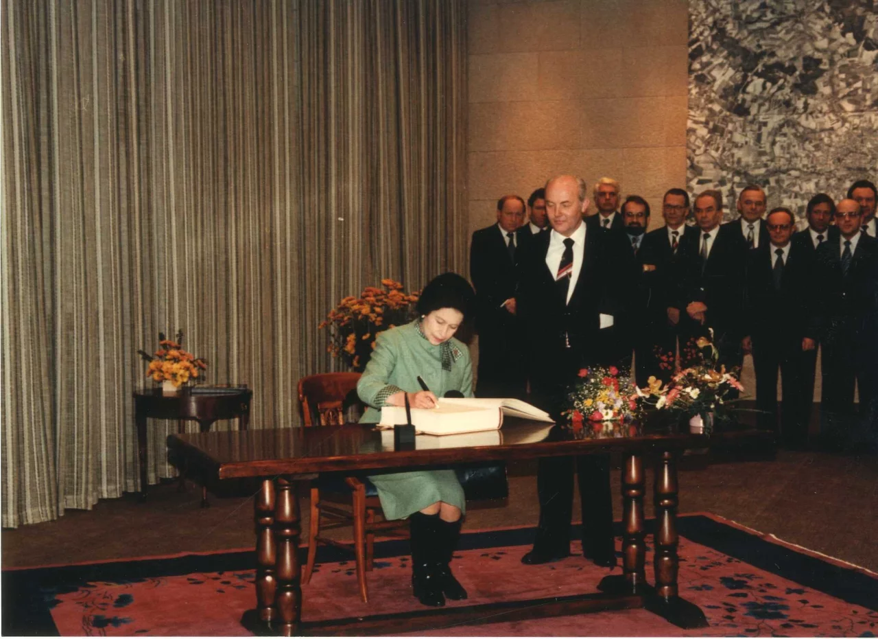 „Wir durften uns vorher aufstellen, dann kam die Queen nach einigen Minuten zusammen mit Bürgermeister Reinhard Wilmbusse in den Saal“, erinnert sich Zeitzeuge Karl-Heinz Richter. Der damals 42-Jährige saß für die CDU im Lemgoer Rat, der für den kurzen Besuch im Rathaus von Elizabeth II. vollzählig angetreten war. „Die ungemein zierliche Königin machte einen sehr netten, freundlichen Eindruck“, erinnert sich der heute 84-Jährige. „Das Bild vom Eintrag ins Goldene Buch der Stadt steht heute noch auf meinem Schreibtisch. Leider bin ich der einzige, der von den abgebildeten Personen noch lebt“, so Richter.