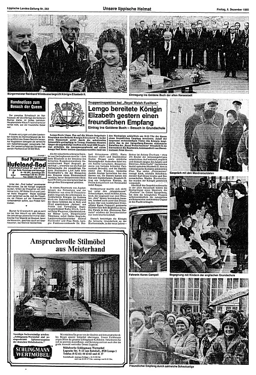Und weiter: In der örtlichen Presse war bereits von einem „Jahrhundertereignis“ die Rede, obwohl der Schwerpunkt des Besuchs weniger bei der Stadt als auf den Aufenthalt bei den Soldaten lag. Dazu gehörten die Inspektion einer Ehrengarde, der Besuch der damaligen britischen Grundschule und der Unterkünfte der Soldaten. Nach dem stark durchgetakteten Ablaufplan hielt sich die Königin nicht länger als 25 Minuten im Lemgoer Rathaus auf, während die gesamte Lemgo-Visite mit knapp sechs Stunden geplant war. Im Rathaus trug sie sich ins Goldene Buch der alten Hansestadt ein.