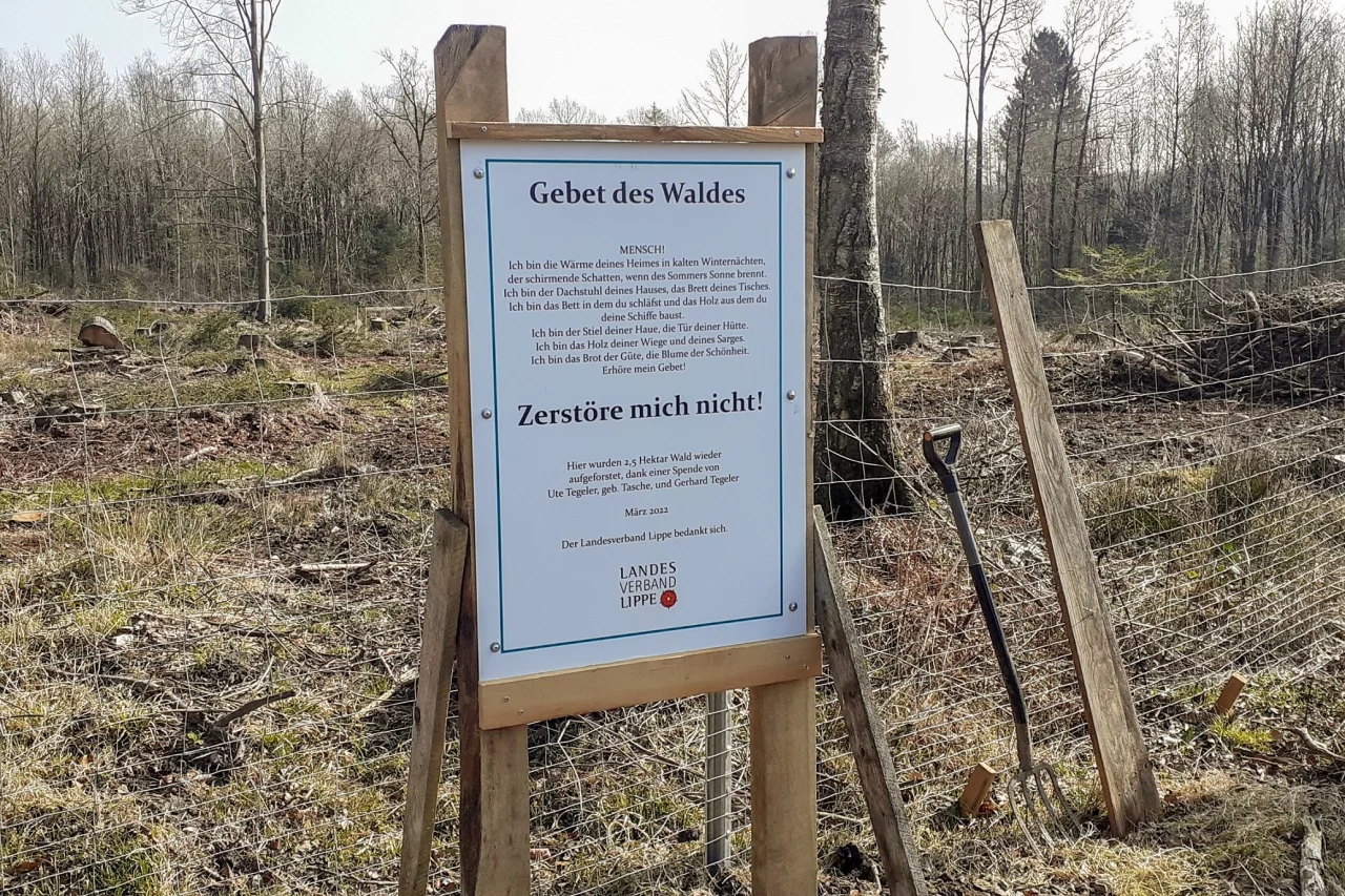 Der Betrag wurde zur Bepflanzung einer Fläche bei Fissenknick (Horn-Bad Meinberg) genutzt. Gepflanzt wurden dort 1950 Traubeneichen, Esskastanien, Elsbeeren, Walnüsse und Baumhasel. An beiden Flächen hat der Landesverband Schilder zum Dank errichtet; sie zitieren auf Wunsch von Ute und Gerhard Tegeler ein Gedicht, das mit „Gebet des Waldes“ überschrieben ist und die Menschen ganz konkret zum Respekt vor dem Wald und zu seinem Schutz aufruft. „Ute und Gerhard Tegeler stehen beispielhaft für die Verbundenheit der Lipper zu ihrem Wald und für ihre große Bereitschaft, den Landesverband bei der Wiederaufforstung seiner Flächen zu unterstützen“, sagt Verbandsvorsteher Jörg Düning-Gast.