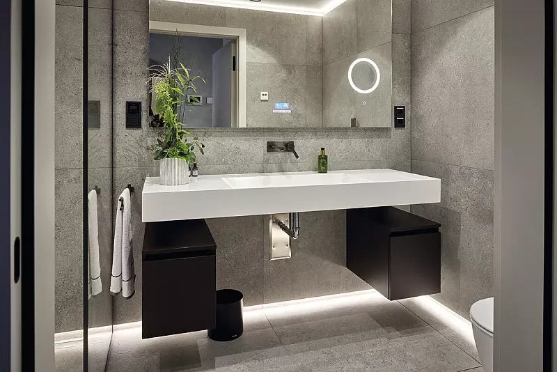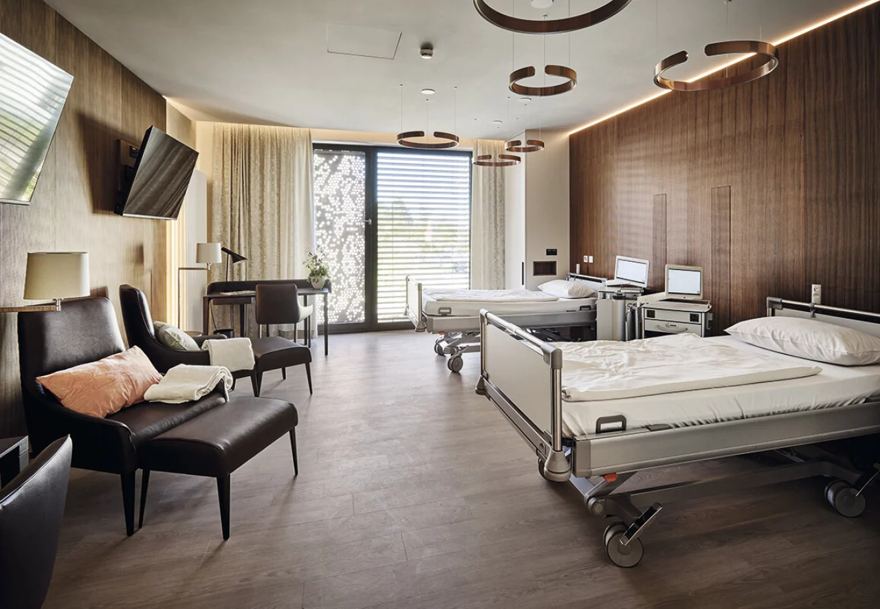 Die Zimmerausstattung sei mit einem Hotelstandard vergleichbar. Mobiliar, Boden und Wandvertäfelung seien hochwertig und aufeinander abgestimmt, medizinische Anschlüsse träten in den Hintergrund. Dazu kämen bodentiefe Fenster sowie Decken-, Steh- und Schreibtischlampen. Die Duschen sind nach Angaben der Verantwortlichen geräumig und barrierefrei gestaltet. Auf der Station können die Patienten neben dem Zimmer auch eine Lounge mit eigener Küche, separatem Essbereich und Terrasse nutzen.