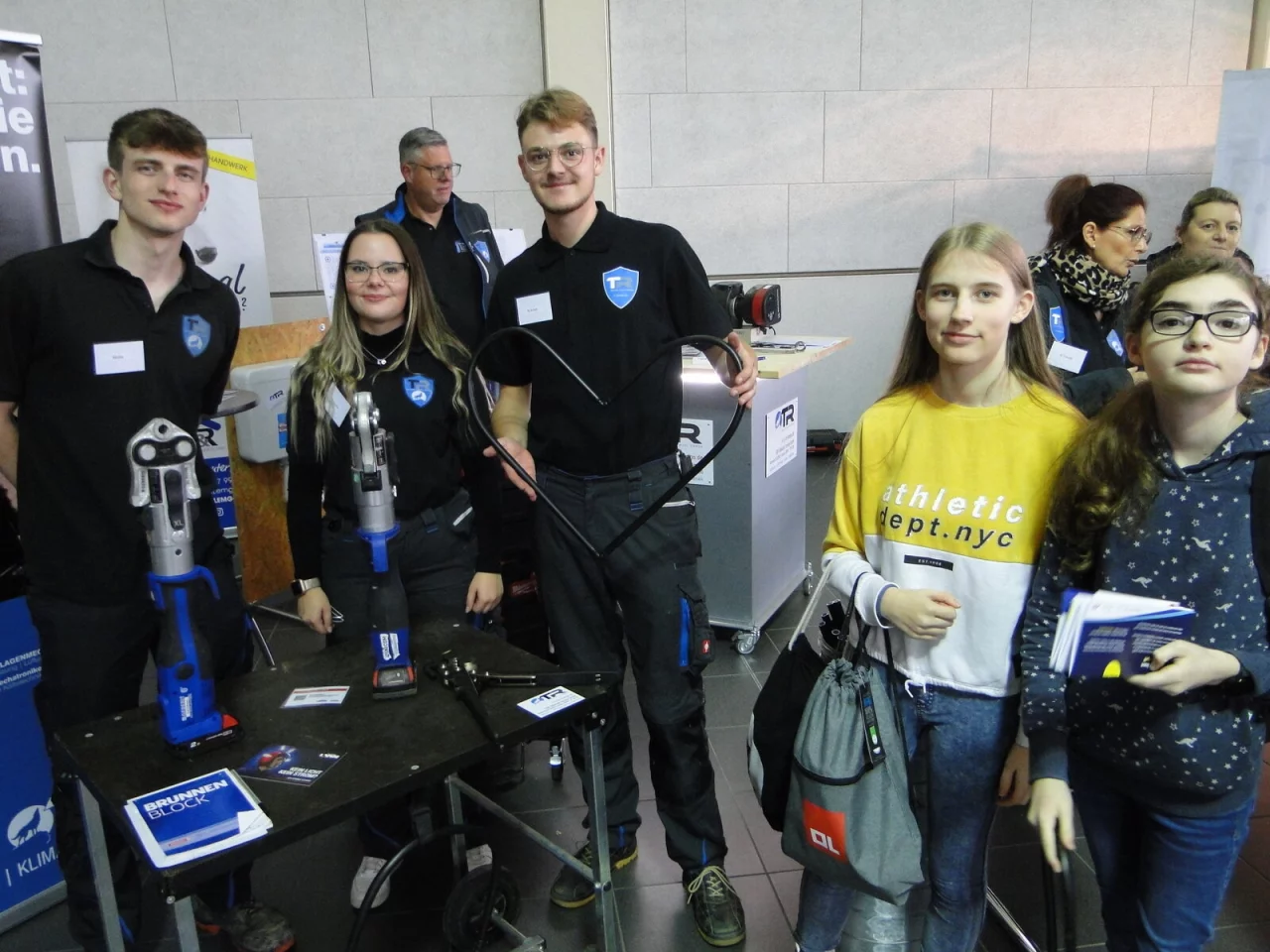 Kreis Lippe. Ein Herz aus Kunststoffrohr, mit den eigenen Händen hergestellt, dieses Angebot von Michelle Budde und Niklas Artelt am Stand des "TR-Gebäudeservice" zieht Schülerinnen wie Selena und Lisa (Heinrich-Drake Realschule) magnetisch an. "Normalerweise basteln wir keine Herzen", sagt Niklas Artelt und lacht. Als Anlagemechaniker hat der "TR"-Geselle ganz andere Herausforderungen zu meistern. Die werden im Spruch von Lara "Croft" Manor auf dem witzigen Hintergrundplakat greifbar: "Einfach mal die Presse halten".