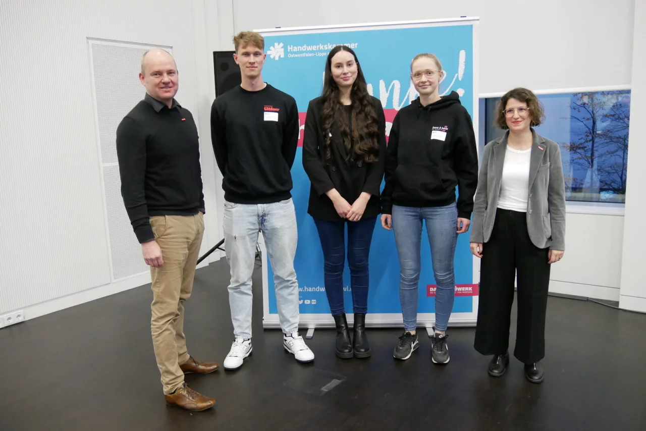 Die Botschafter aus dem Kreis Lippe sind der Zimmerer Janne Lüngen vom Betrieb Adolf Schulze aus Lage, die Tischlerin Johanna Stoellger von „benz & benz“ aus Bad Salzuflen, der Zimmerer Marvin Klatte von Dachdecker Gläßner aus Bad Salzuflen und die Kauffrau für Büromanagement Lina Ayesa Rolón von den Vogelsänger Studios aus Lage.