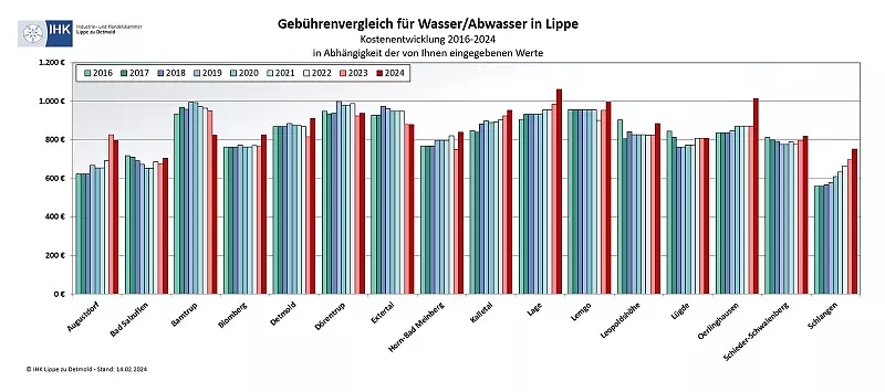 Die IHK Lippe hat nach eigenen Angaben im Februar bei den 16 lippischen Kommunen die aktuellen Gebühren für Wasser und Abwasser erhoben. „In einem Online-Rechner können Unternehmen, aber auch Privathaushalte, ermitteln, wie viel mehr oder weniger Geld die gleiche Leistung in einer anderen lippischen Kommune kostet. Unser Rechner sorgt für mehr Transparenz bei den Gebühren“, sagt Matthias Carl, Abteilungsleiter der IHK Lippe.