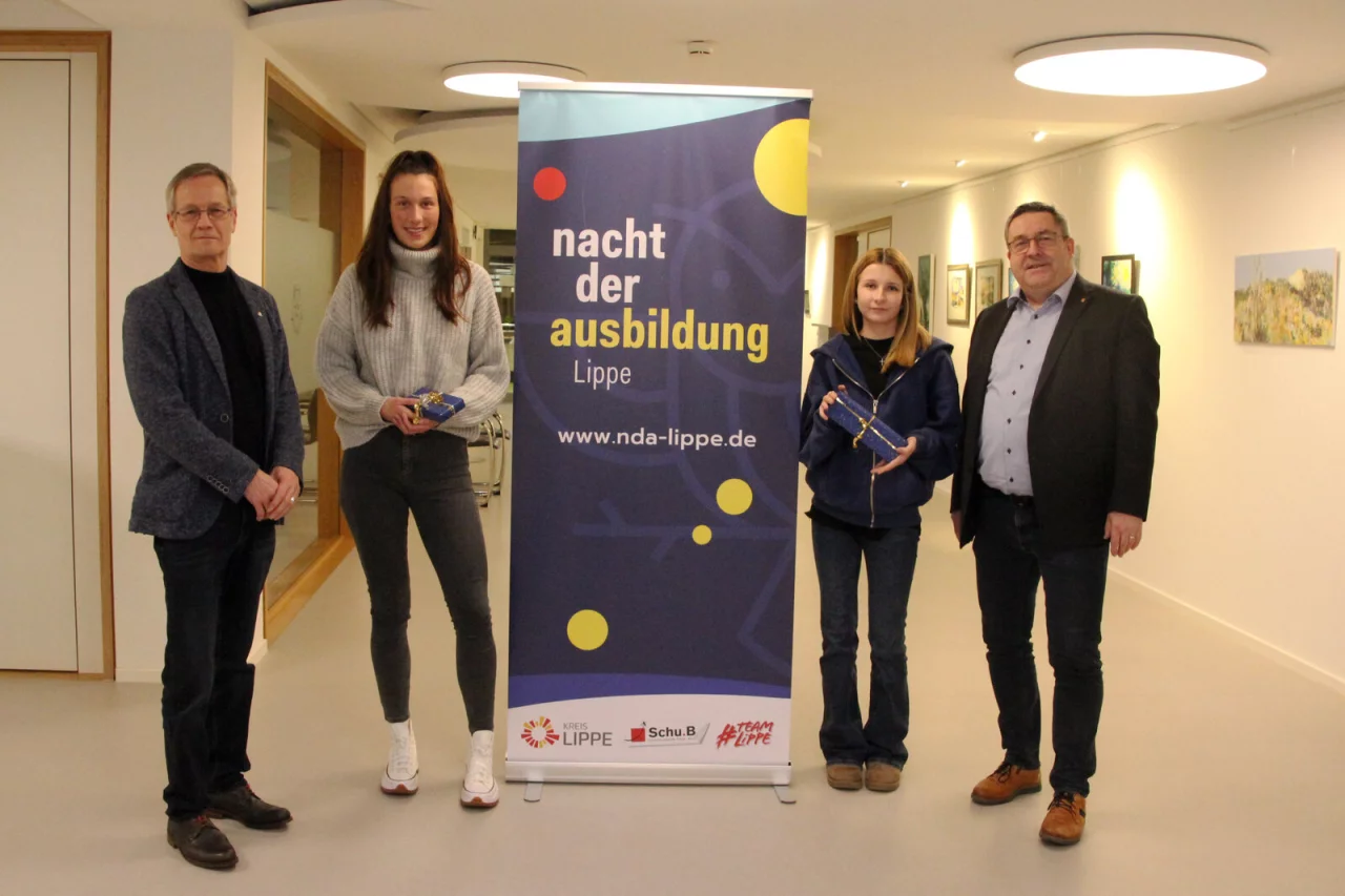 Vor der Preisübergabe hatte der Landrat die Gewinnerinnen mit verschiedenen Fragen nach ihren Berufswünschen, den Betrieben, die sie besucht hatten, und nach ihrer generellen Meinung zur Nacht der Ausbildung gelöchert. „Ich war mit meiner Mutter beim DRK in Lemgo und bei Eben Ezer in Lemgo“, resümierte Franziska Karwot. Die 15-Jährige wollte bei der Nacht der Ausbildung schauen, ob das Angebot von Eben Ezer zu ihr passt. „Da hat es mir gut gefallen. Ich habe mich jetzt bei der Schule angemeldet“, sagte sie.