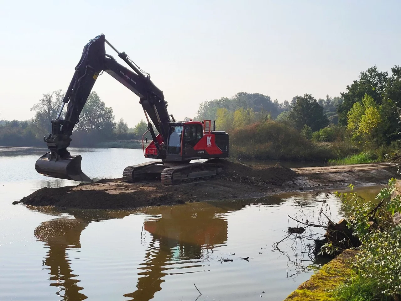 Konkret wurde der alte Damm mit einer 60 Meter langen Spundwand verstärkt. „Das neue Ablaufwerk ist eine Spezialanfertigung und wiegt 28 Tonnen. Der Transport zur neuen Spundwand und das passgenaue Einsetzen waren Maßarbeit“, blickt Arne Brand zurück. Er ist Vertreter des Verbandsvorstehers und Leiter der Zentralen Infrastrukturabteilung. Im Anschluss wurden Baustelle und provisorischer Damm zurückgebaut und diverse Bereiche asphaltiert. „Wir wollten dies bis Ende Dezember abschließen, doch die nasse Witterung hat uns einen Strich durch die Rechnung gemacht“, so Brand.