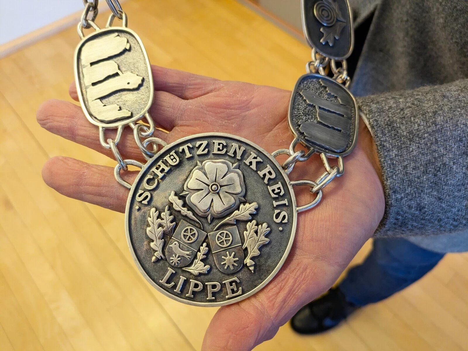 Kreis Lippe. Wenn am Samstag, 10. Mai, das Kreiskönigsschießen des Schützenkreises Lippe in Detmold über die Bühne geht, ist eins sicher: Der neue König wird mit der traditionellen Schützenkette geehrt. Schützenkreis und Landesverband Lippe haben laut einer Pressemitteilung gemeinsam dafür gesorgt, dass die Kette rechtzeitig verlängert wurde und zwei neue Kettenglieder Platz für die Namen der Könige 2025 und 2027 bieten.