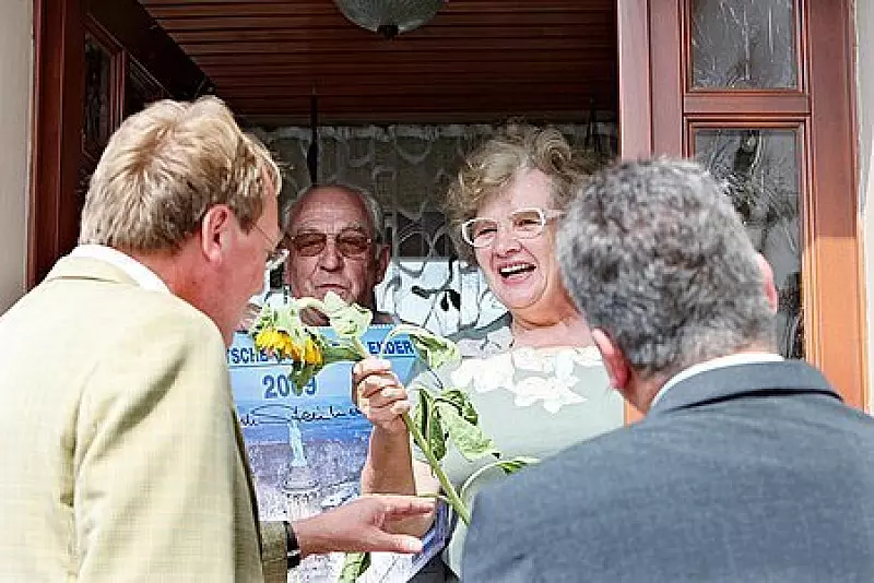Das lässt den Dörentruper Ralf Mühlenmeier kalt: Schwungvoll steuert er die erste Haustür an, ein beherzter Druck auf die Klingel. "Guten Tag, ich will hier Bürgermeister für die CDU werden", in der Aufregung vergisst er glatt, seinen Namen zu sagen. "Soso", Hausherrin Marga Koch erkundigt sich höflich, ob er denn Beamter sei. "Lehrer? Na, das geht ja noch", meint sie. Die Sonnenblume nimmt sie huldvoll entgegen. Mittlerweile ist auch ihr Mann Heinz an die Tür gekommen, in der Hand einen großen Bildkalender. Auf der Titelseite ein Autogramm: Der Schriftzug des Sozialdemokraten Frank-Walter Steinmeier starrt Mühlenmeier entgegen. Der zeigt sich hinreichend beeindruckt, gibt seinen Steckbrief ab und verabschiedet sich artig, auf zum nächsten Haus.