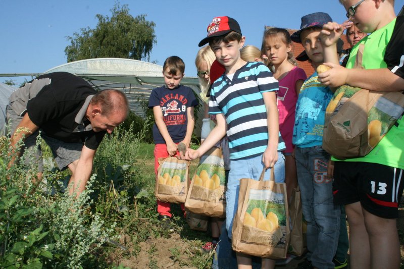 Heinz Blaurock genießt sichtlich den Umgang mit den Kindern, während sein Sohn Frank fleißig mit der Forke die Kartoffeln ans Licht bringt, denn jeder darf sich hier eine Tüte voll für zu Hause sammeln. „Als unser ältester Sohn Kolja in die dritte Klasse in Kachtenhausen ging, hat man uns angesprochen. Seitdem bekommen wir regelmäßig Besuch von Grundschulen und Kindergärten", erzählt Frank Blaurock. Während die Lehrerinnen Marianne Sander und Manja Trölenberg sich noch nach der Kochfestigkeit einzelner Sorten erkundigen, haben die Kinder ihres Erachtens nach genügend Fachwissen gesammelt und sind begeistert, als der Landwirt seinen Trecker anschmeißt und sich jeder auf dem angekoppelten Schüttelsieb-Roder einmal ordentlich lockern lassen kann.