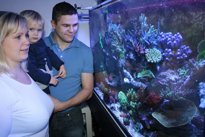 „Inzwischen importieren wir Korallen aus Indonesien, Bali, Florida oder Australien. Auch Muscheln gehören zum Sortiment", erläutert Andreas Martin, der für den technischen Part zuständig ist. Per Computer steuert der Werkzeugmechaniker die zum großen Teil automatisierte Technik der Aquarienanlage. „Das ist schon ein kostspieliges, aber schönes Hobby", gibt Anna Martin zu. Ein komplett bestücktes Meerwasserbecken habe oft einen Wert von mehreren tausend Euro. „Die Korallen gibt es ab zehn Euro das Stück. Nach oben sind fast keine Grenzen gesetzt", weiß die junge Mutter.