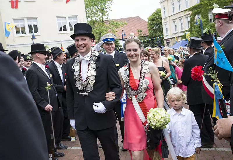 Wer tritt die Nachfolge an von König Bernd I. Marchlowitz und Königin Sabrina I. Schröder? Die Antwort auf diese Frage gibt es am Samstag, 17. Juni, gegen 14 Uhr im Festzelt, denn dann liegt das Ergebnis des mit besonderer Spannung erwarteten Königsschießens vor. Ein Wettlauf gegen die Uhr liegt vor dem neuen Thron, denn bereits um 16.15 Uhr wird er auf dem Marktplatz offiziell vorgestellt.