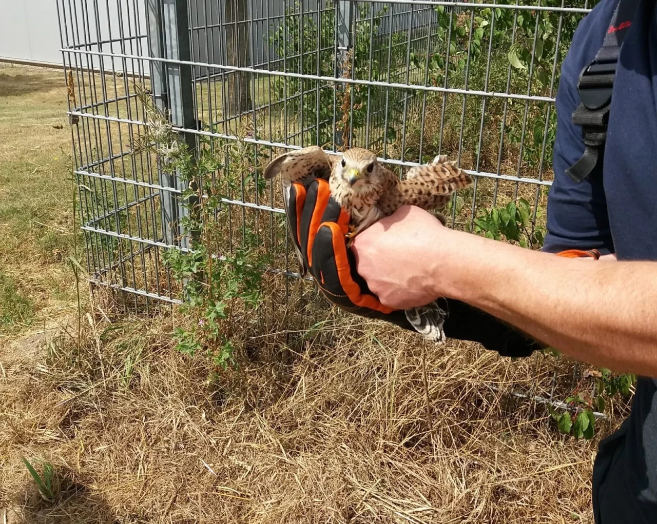 Mitarbeiter einer dort ansässigen Firma hatten hinter einem Gebäude den verletzten Vogel im Gras entdeckt und die Feuerwehr alarmiert. Vor Ort stellten die Einsatzkräfte fest, dass es sich bei dem Tier um einen Falken handelt.