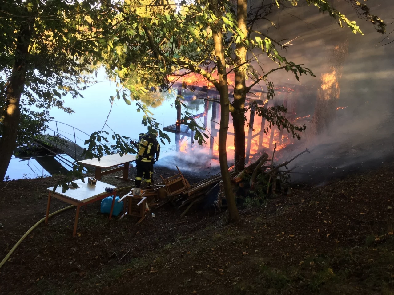 Bereits während der Anfahrt der Einsatzkräfte war eine starke Rauchentwicklung erkennbar. Bei Eintreffen der Einsatzkräfte brannte an einem Teich eine Gartenhütte in voller Ausdehnung. Die umliegende Vegetation/Bepflanzung war ebenfalls in Brand geraten.