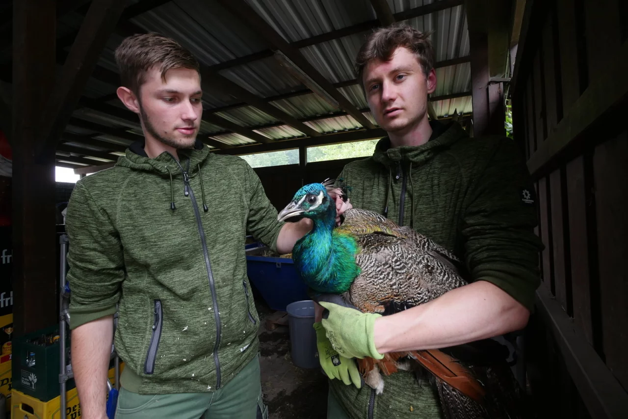 „Ich mache den Job nun ja schon ein paar Jährchen, aber einen Pfau hatten wir noch nie." Nun wohnt das Tier in einer Transportbox im ehemaligen Carport der Detmolder Adlerwarte, die ihn als Auffangstation für Wildvögel aufnahm und nun seinen Eigentümer sucht. „Eine Voliere ist gerade nicht frei", berichten die FÖJler Lennart Plaumann und Milan Voß, die das kräftige Tier beim Fototermin gut festhalten müssen.