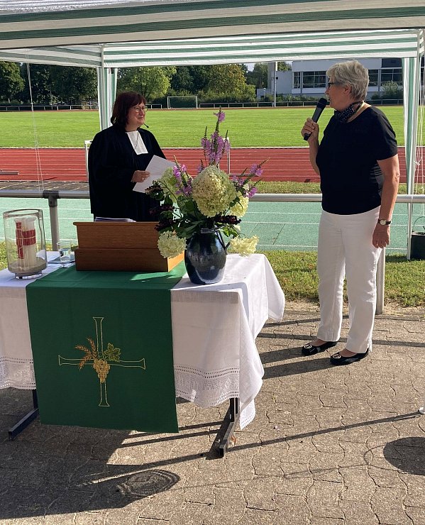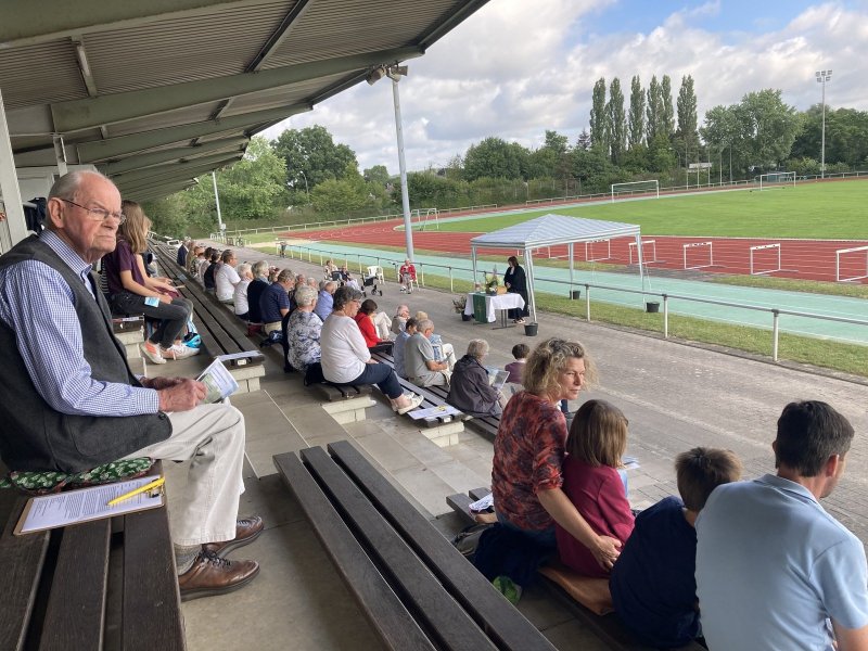 In dem von Pfarrerin Christina Hilkemeier geleiteten Gottesdienst waren sowohl fröhliche Lieder als auch nachdenkliche Töne zu hören, berichtet die Kirchengemeinde. „Endlich einmal wieder zusammen singen!" – so verlieh ein Gemeindeglied seiner Freude Ausdruck, als das erste bekannte Lied angestimmt wurde. Denn anders als in der Kirche, wo seit Monaten die Gemeinde aufgrund der dortigen erhöhten Infektionsgefahr nicht singen kann, war dies open-air, unter den Tribünen des Leichtathletik-Stadions erstmals wieder möglich.