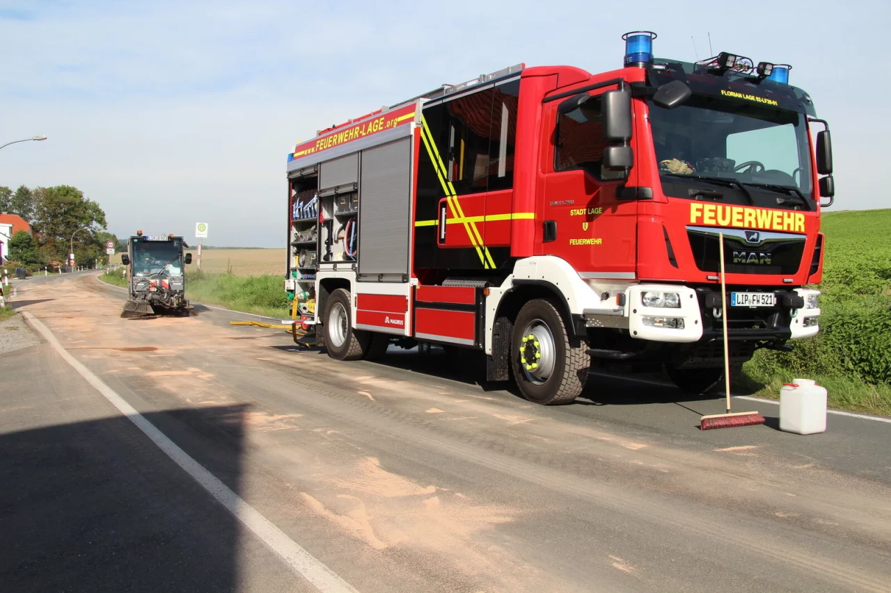 Die Einheiten aus Lage und Heiden seien ausgerückt und hätten die Straße großflächig abstreuen müssen, weil Autofahrer, die über das Öl des Landwirts gefahren seien, dieses verteilt hätten. Dann kam noch die Kehrmaschine des Bauhofs zum Einsatz, um die Straße wieder zu reinigen. Die Polizei beurteilte die Straße abschließend und gab sie wieder für den Verkehr frei.