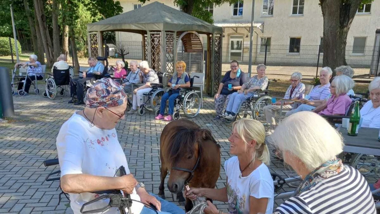 Zur großen Freude der Senioren waren jüngst wieder die Ponys Smarty und Roy zu Gast im Karolinenheim. Die zutraulichen Tiere, die für derartige Therapieeinsätze geschult sind, holten sich zahlreiche Streicheleinheiten und die ein oder andere Leckerei. Es wurden nicht nur die Senioren im Park erfreut - die Ponys wurden im Fahrstuhl auch zu bettlägerigen Bewohnern geführt, wo sie ihnen direkt am Bett ein besonderes Erlebnis ermöglichten.