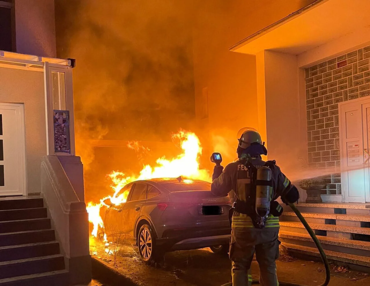 Als die Feuerwehr eintraf, stand das E-Auto in einer Einfahrt zwischen zwei Häusern im Vollbrand. Das Feuer hatte bereits auf die in der Nähe stehenden Mülltonnen übergegriffen. Ein Trupp löschte das brennende Fahrzeug unter Atemschutz mit einem C-Rohr, während ein weiterer Trupp die Fassaden kühlte, um ein Übergreifen der Flammen auf die Gebäude zu verhindern. Nachdem das Fahrzeug abgelöscht war, kontrollierte der Angriffstrupp die sich hinter dem Fahrzeug befindlichen Garagen auf mögliche Glutnester.