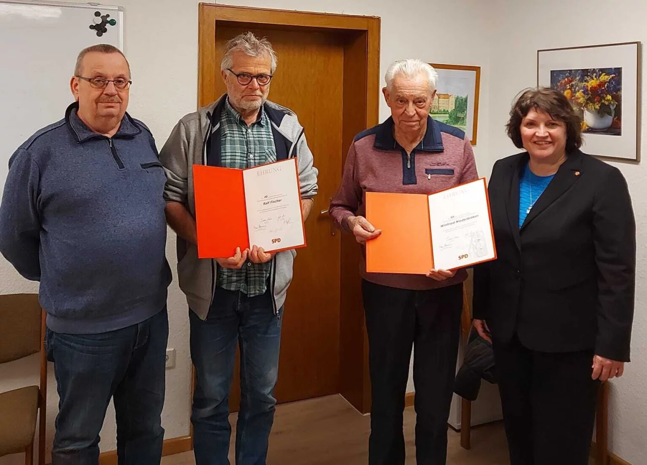Abschließend wurden zwei Parteimitglieder für langjährige Mitgliedschaft geehrt: Winfried Niederbröker ist seit 50 Jahren Mitglied in der SPD und hat in unterschiedlichsten Positionen wertvolle Arbeit für die Partei geleistet. Ralf Fischer trägt seit 40 Jahren das rote Parteibuch der SPD. Die Laudatio hielt Ellen Stock und gratulierte gemeinsam mit Vorsitzendem Detlef Steffen den beiden Jubilaren.