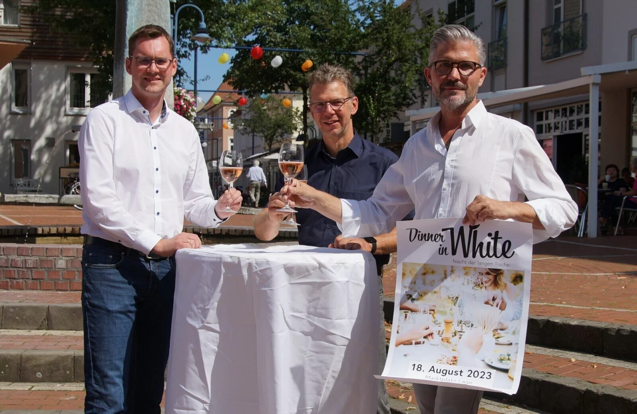 Der Stadtmarketing Verein erinnert außerdem daran, dass das Mitbringen eigener Tische und Stühle an diesem Abend nicht gestattet ist. Gleichzeitig weisen die Veranstalter darauf hin, dass jeder Gast, der während des "Dinner in White" dem Stadtmarketingverein Lage beitrete, im nächsten Jahr kostenfrei einen Tisch reservieren könne.
