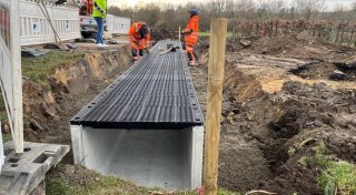 Das Wasser wird dort zu einem kleinen Gewässer am Lönsweg geführt. „Dank der Unterstützung der dortigen Grundstückseigentümer konnte die Stadt Lage einen Streifen entlang der Bebauung erwerben. Auf dieser Fläche ist durch Mitarbeiter der Stadt Lage ein Auffanggraben von fast 200 Metern Länge sowie ein knapp 80 Zentimeter hoher Damm (160 m lang) angelegt worden“, schreibt die Stadt.