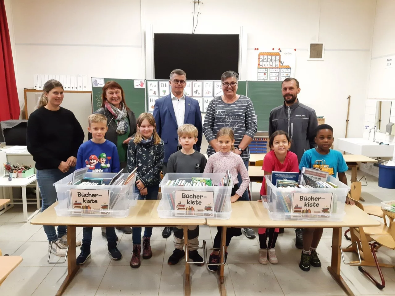 Vertreter der Fördervereine der Grundschule Lage und der Stadtbücherei Lage haben die drei Bücherkisten Ende Oktober an die Klassen überreicht. Die Klassensprecherinnen und -sprecher der Jahrgangsstufe 3 waren bei der Spendenübergabe dabei und nahmen die Kisten begeistert in Empfang. Das Dachgeschoss der Grundschule wird gerade saniert, und daher fehlen der Schule Räumlichkeiten für die Schulbücherei, wie es in der Pressemitteilung heißt. Damit bei den Schülerinnen und Schüler das Lesen aber nicht zu kurz kommt, wurden von den beiden Vereinen 75 Bücher im Gesamtwert von rund 950 Euro angeschafft. Die Bücher bilden eine Art „Wanderbibliothek“ zwischen den Klassen. Schülerinnen und Schüler können so auch während der Bauphase Bücher ausleihen und ihrem Lesehobby frönen.