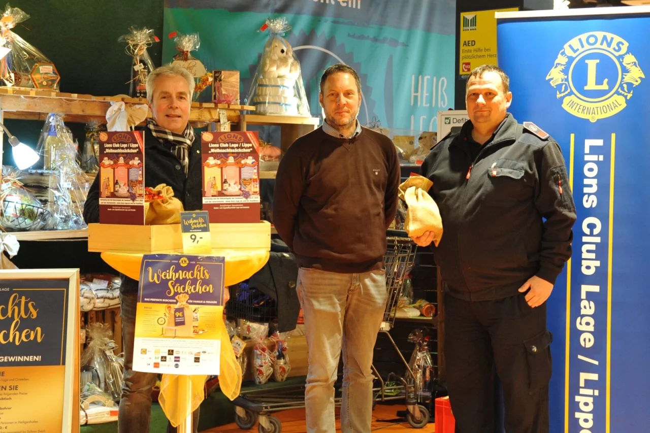 Lions-Präsident Thomas Schäfer, Dirk Steinhage (Arbeitskreis Weihnachtssäckchen) und Jan Althöfer von der Jugendfeuerwehr Lage hoffen, dass die diesjährige Weihnachtssäckchen-Aktion an die Erfolge in den Vorjahren anknüpfen kann. Details zu den Gewinnen werden auf der Internetseite der Lions unter www.lions-lage.de veröffentlicht.