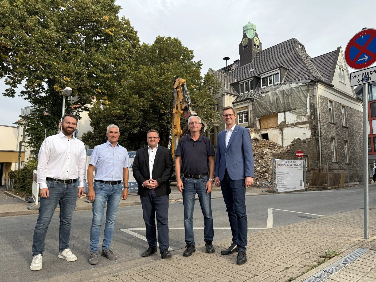 „Ein Neubau – etwas kleiner, aber funktionaler – wird an gleicher Stelle entstehen“, erläutert Thorsten Paulussen, 1. Beigeordneter und Leiter des Fachbereichs Stadtentwicklung, beim Ortstermin. Gemeinsam mit Bürgermeister Matthias Kalkreuter, Frederik Topp (Vorsitzender des Bau- und Planungsausschusses) und Hans Hofste (Vorsitzender des Ausschusses für Wirtschaft und Stadtentwicklung) machte er sich ein Bild vom Fortschritt.