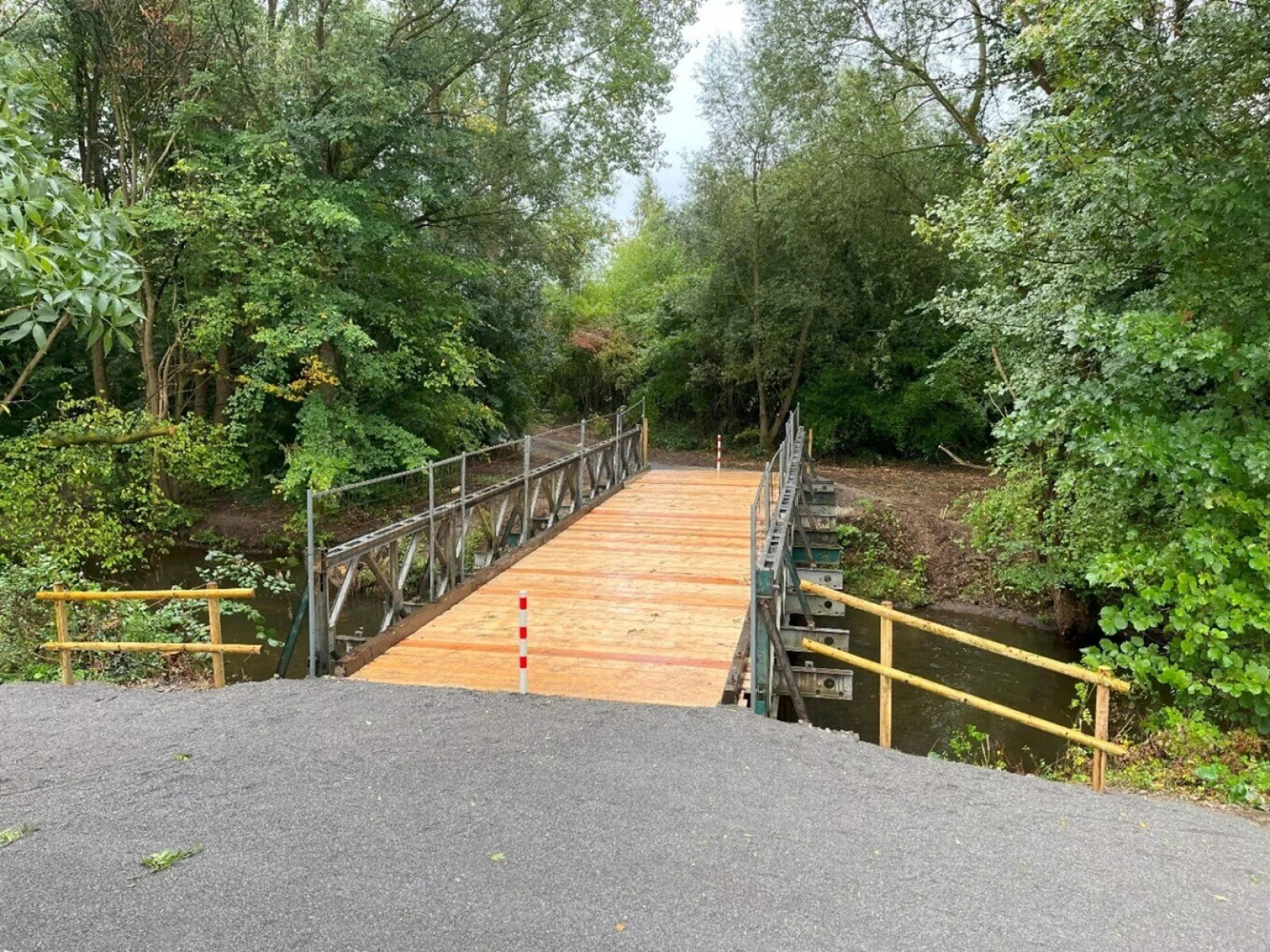 Weil sie baufällig war, war die alte Brücke Anfang September abgerissen worden. Für die neue Behelfsbrücke musste laut Mitteilung der Stadt Lage zunächst der Bereich geräumt und angeglichen werden.
