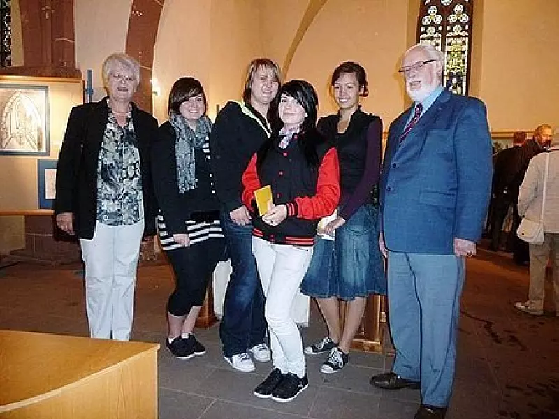 Komplettansichten und Teilaspekte wurden mit viel Engagement erstellt, die gelungensten Kunstwerke vom Heimatbund prämiert. Die Schülerinnen Diana Hopp, Fabienne Termöllen, Elena Sarycewa und Cornelia Epp durften sich über ein kleines Präsent freuen, das ihnen vom Heimatbund-Vorsitzenden Manfred Sieker überreicht wurde. Dass die Bilder auf den von der Stadt zur Verfügung gestellten Stellwänden zur Geltung kommen konnten, ist dem unermüdlichen Einsatz der Ehepaare Siekmöller und Brinkmann zu verdanken und wurde mit Blumensträußen gewürdigt. So durften sich Pfarrer Tiessen als Initiator der Ausstellung und Manfred Sieker für den Heimatbund als Co-Träger über den gelungenen Auftakt freuen.