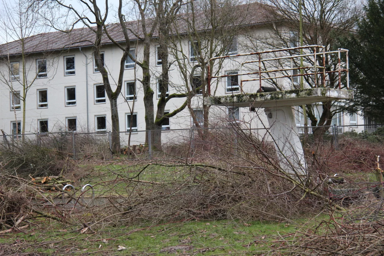 „Die Mitarbeiter sollten auf dem Gelände Sport treiben können“, sagt Krankenhaus-Pressesprecher Thomas Drawe. Mit speziellen Münzen konnten Schwimmer das Drehtor im Zaun um das Freibad passieren. Das diente dazu, dass nicht beispielsweise Patienten oder Besucher auf die Idee kamen, sich mal eben im Becken zu erfrischen. Vor knapp 30 Jahren wurde das Schwimmbad für immer geschlossen. Der Unterhaltungs- und Sanierungsaufwand war zu groß geworden. Heute dient das Becken als Löschteich für die Feuerwehr.