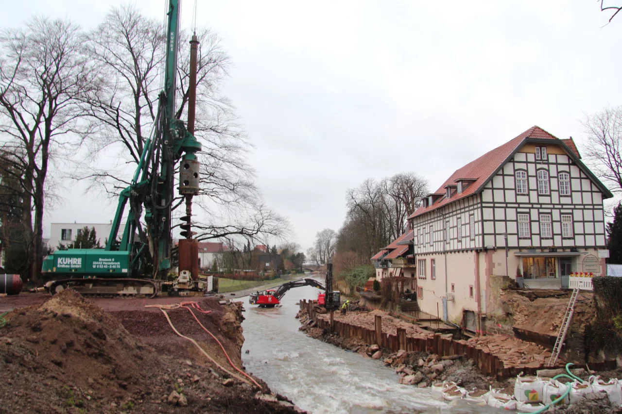 Kommende Woche muss jedoch zunächst der 120-Tonnen-Bohrer per Schwerlasttransport auf die andere Seite der Bega umgesetzt werden – über die Brücke an der Engelbert-Kämpfer-Straße geht das nicht. Das Gewicht des Gespanns ist zu groß. Der Lkw-Fahrer wird nach Angaben von Matthias Rath daher den Umweg über den Steinweg nehmen. Für den Brückenbau hat die Stadt Kosten von 800.000 Euro kalkuliert. Dazu kommen Millionen für den Hochwasserschutz (siehe Info).