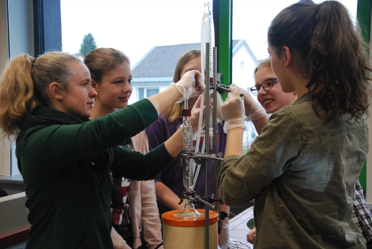 Die Schüler haben zunächst mit Reagenzglasversuchen Aromastoffe selbst hergestellt und diese anhand des Geruchs Kategorien zugeordnet. Später durften sie große Glasapparaturen zusammenbauen, um darin Kunststoffe herzustellen. „Auch ein Theorie-Teil gehört dazu, in dem sich die besonders Begabten hervortun können“, erzählt Olaf Göke, Chemielehrer und Workshopleiter. Der Fokus liege aber auf der praktischen Arbeit.