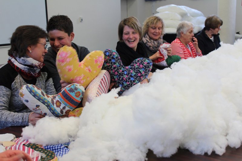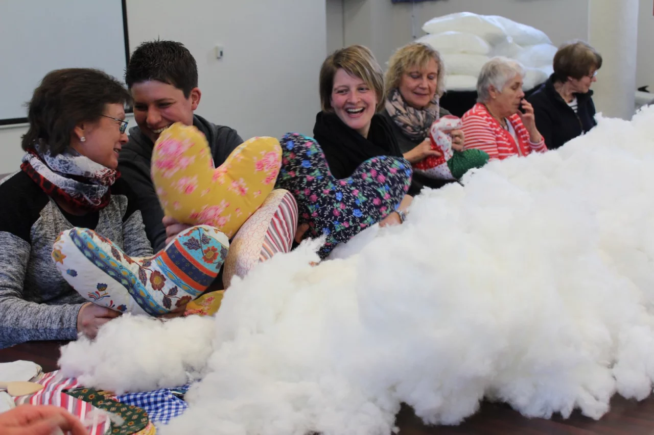 Frauen, Männer und Kinder stopften die bereits im Voraus gefertigten Kissenhüllen in Herzform aus und nähten sie zusammen. Nancy Friis-Jensen, eine dänische Krankenschwester, brachte die Idee dieser speziellen Kissen für Brustkrebspatientinnen 2006 aus Amerika mit. Michaela Rathkolb griff sie 2011 für Lippe auf: „Damals saßen wir noch mit Nähmaschinen zusammen." Doch jetzt sei die Produktion höher, weil die Hüllen schon vorab genäht würden.