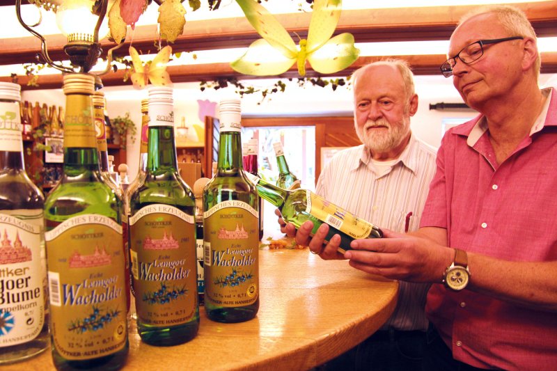Schöttkers Wacholder-Geschichte reicht bis 1901 zurück, die von Wippermann (heute im Besitz von Heydt in Haselünne) bis ins 19. Jahrhundert. Schlachter verlangten seinerzeit erst ein Gläschen, bevor sie das Messer wetzten. Bei Schöttker füllte „Tante Tilla" den Wacholder aus alten Tongefäßen in Flaschen um, die die Kunden mitbrachten. Dann war da Familie Tintelnot, die ihren eigenen Schnaps hatte. Und Wirtin „Puttchen": Bei ihr gab es zum Wacholder auf Wunsch einen Schuss Kräuterbitter. „Boonekamp aus der Maggi-Flasche, so viel man wollte", erinnert sich Hermann Hentschel.